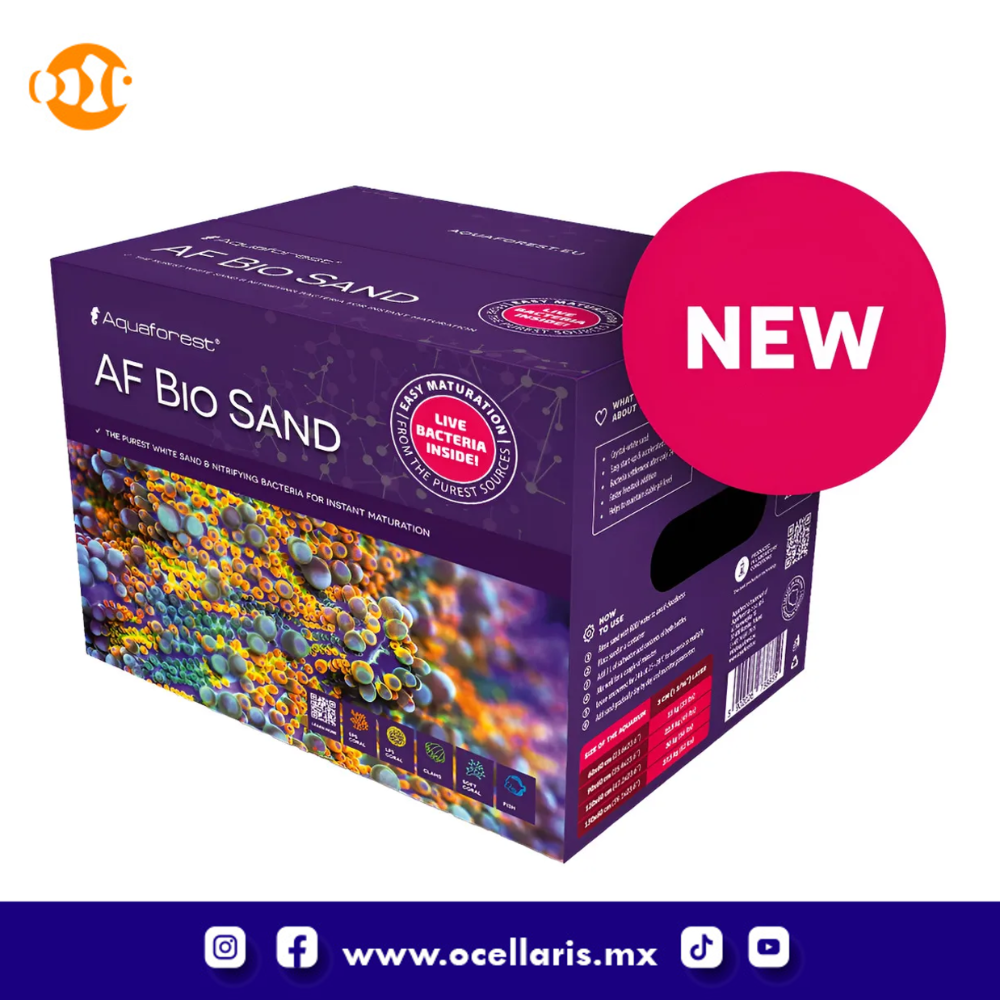 Acelera el proceso de maduración del acuario. AF Bio Sand es una arena blanca natural derivada de depósitos de la más alta calidad. Está libre de contaminantes y su contenido de carbonato de calcio ayuda a estabilizar la composición química del agua. La tecnología de vanguardia de AF Bio Sand acelera significativamente el proceso de maduración de un acuario y permite una incorporación más rápida de animales a un tanque recién instalado. Las botellas incluidas contienen cepas de bacterias nitrificantes aisladas en laboratorio y un alimento que facilita su desarrollo y multiplicación. Inicio más rápido del ciclo del nitrógeno y eliminación de compuestos nocivos. La fórmula especializada del producto garantiza el cierre del ciclo del nitrógeno y la eliminación de compuestos químicos nocivos mucho más rápido que con sustratos tradicionales. La facilidad de uso de AF Bio Sand permite preparar arena al instante para su uso en el acuario. Gracias a su amplia gama de aplicaciones, AF Bio Sand también es ideal como suplemento del sustrato en acuarios maduros. La granulación de la arena es de 1-2 mm. Preparación instantánea de la arena para uso en el acuario. Preparación: Durante el transporte, pueden aparecer residuos de arena, lo cual es totalmente seguro para el acuario. Sin embargo, para evitar la turbidez del agua, recomendamos encarecidamente enjuagar la arena con agua RODI antes de usarla. Vierta el contenido de ambas botellas en 3 litros de agua salada, mezcle bien, añada la arena a la bolsa y deje reposar durante 24 horas. Para facilitar la proliferación bacteriana, no cierre la bolsa. No se recomienda almacenarla en lugares fríos, ya que esto aumenta significativamente el tiempo de multiplicación bacteriana. La temperatura óptima de maduración de la arena es de unos 25-28 °C (77-82 °F). Después de 24 horas, la arena estará lista para su uso en el acuario. Añada arena gradualmente al acuario (pequeñas cantidades a diario) y controle los cambios en los parámetros.