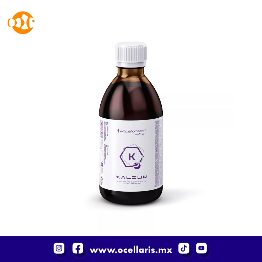 es un suplemento de potasio altamente concentrado para apoyar las funciones neurológicas, el transporte de nutrientes y la fuerte coloración rosada/roja en los corales. El uso de medios de filtración a base de zeolitas en el acuario puede provocar una deficiencia de potasio. Por lo tanto, se recomienda el uso regular y equilibrado de Kalium para mantener un nivel adecuado de potasio en su sistema de arrecifes. El nivel recomendado de potasio en el acuario de arrecife es de 360-380 mg/l.