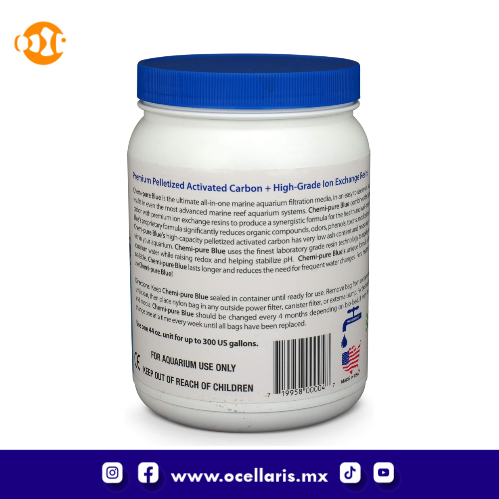 Mezcla de medios filtrantes especializados para mejorar rápidamente la calidad del agua. Al combinar carbón peletizado de primera calidad con resinas de intercambio iónico especializadas y colocarlas dentro de una bolsa de medios de nailon de malla fina, Chemi-Pure Blue ofrece una forma conveniente y efectiva para eliminar rápidamente los compuestos orgánicos y mejorar la claridad del agua en su acuario.