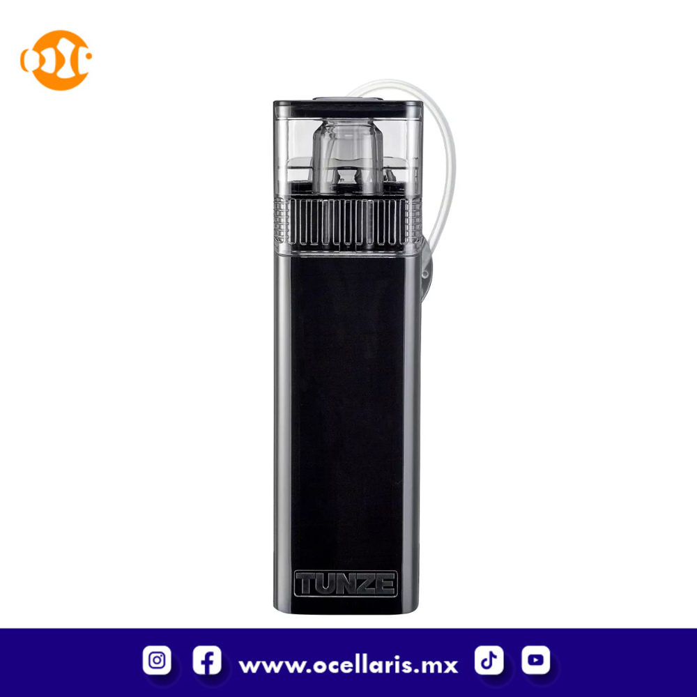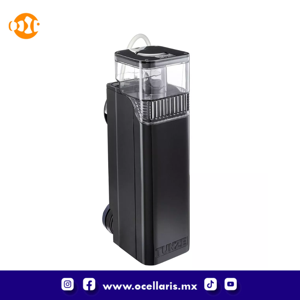 utiliza el principio de "Flash Skimming" de Tunze. El skimmer es silencioso y genera un gran volumen de pequeñas burbujas para un funcionamiento eficiente del skimmer. Funciona de forma independiente sin necesidad de ningún equipo adicional (bombas de alimentación, etc.) y se monta en el tanque a través de un conveniente soporte magnético lo suficientemente fuerte para vidrio de hasta 1/2" de espesor.