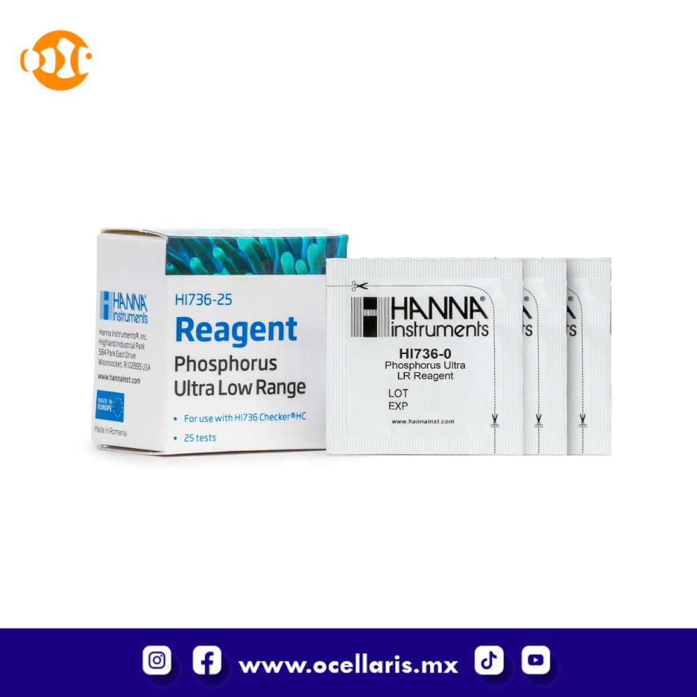 Los HI736-25 son reactivos de alta calidad que se suministran preparados, lo que permite a los usuarios lograr mediciones rápidas y precisas con su Checker® HC para fósforo intervalo ultra bajo. Estos reactivos siguen el método del ácido ascórbico en el cual la reacción entre el fósforo y los reactivos causa un color azul en la muestra. Al agregar el sobre de reactivo HI736-25 a la muestra, la reacción tendrá lugar y el HI736 determinará la concentración de acuerdo al color producido. Los resultados se mostrarán en ppb de fósforo. Estos reactivos están diseñados para utilizarse con muestras que tienen un intervalo esperado de 0 a 200 ppb de fósforo.