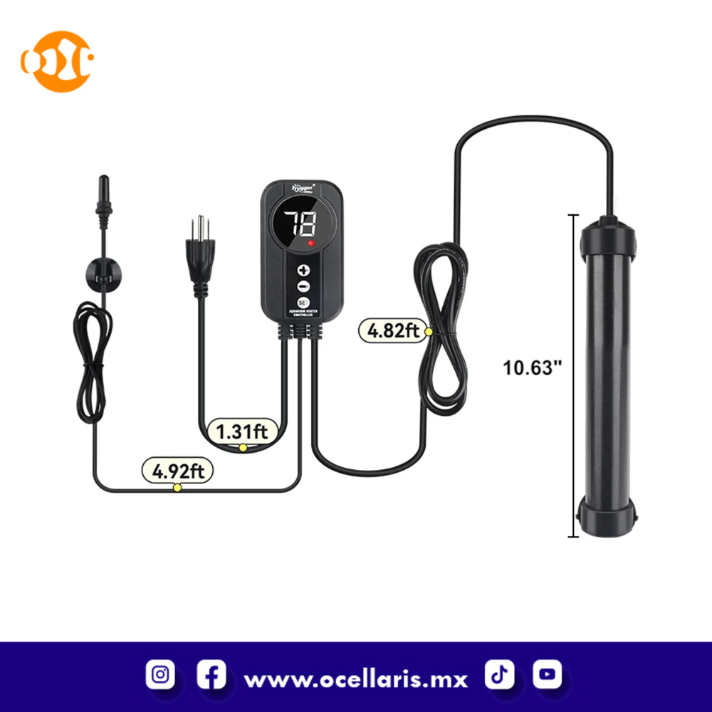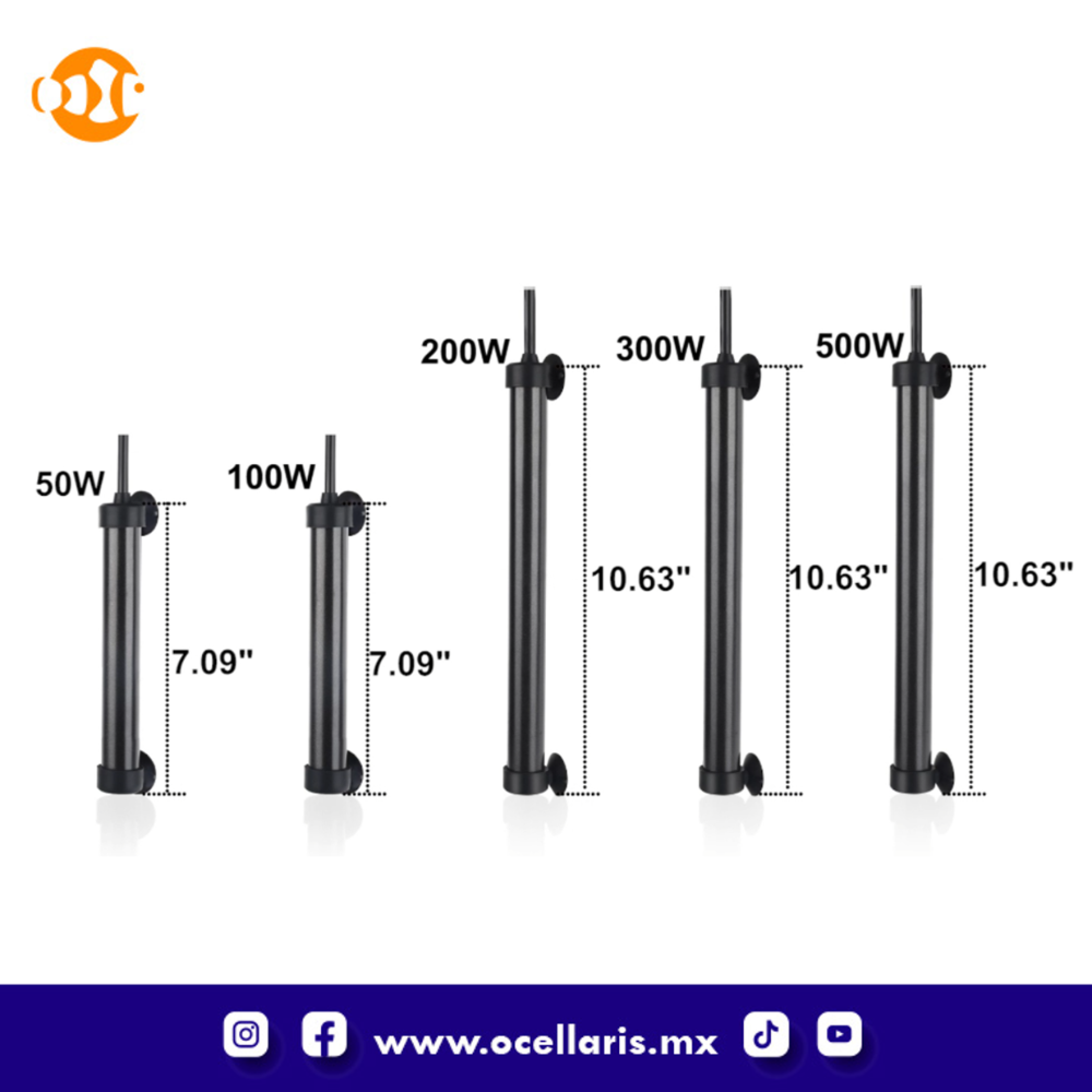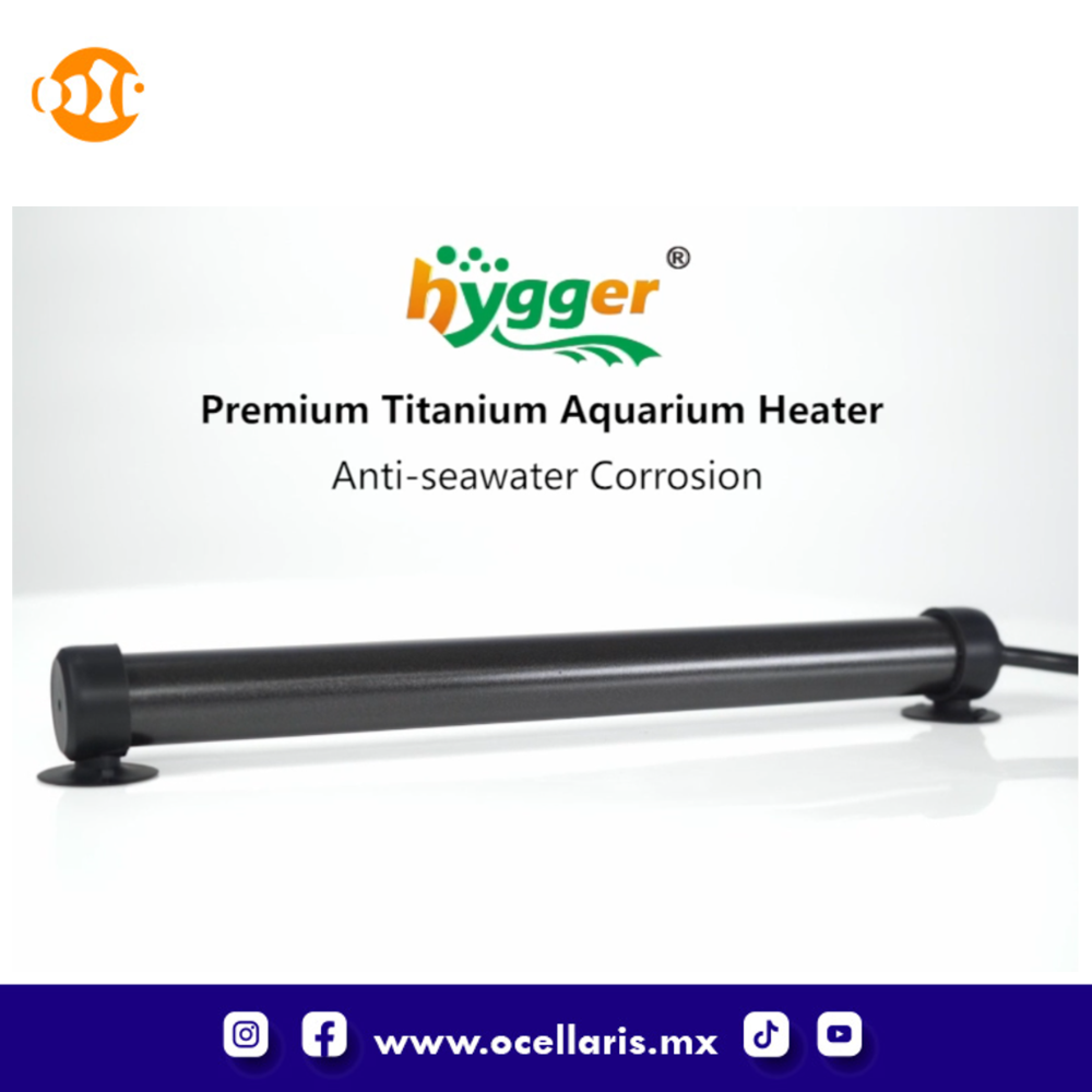 El calentador de titanio Hygger 085 de 500 W es apto para acuarios de agua salada y dulce de entre 265 a 302 litros (70 a 80 galones). Está fabricado con aleación de titanio aeroespacial TA2 y su tubo está recubierto de teflón. Incorpora un chip IC inteligente, un sistema de control de temperatura preciso y función de memoria. Un controlador externo muestra y ajusta la temperatura del agua. Características: Función de memoria de calentamiento: La precisión de temperatura del calentador es de 1 °F/°C y el rango de ajuste es de 20 °C a 32 °C (68 °F a 90 °F). El calentador de titanio tiene una alta clasificación de impermeabilidad IP68 y es a prueba de explosiones, corrosión y ozono. En caso de corte de energía, el calentador se calentará al restablecerse la energía según la última configuración. Calentamiento rápido, seguro y duradero: La varilla de titanio de aviación convierte completamente la energía eléctrica en calor, ahorrando energía y calentando de forma segura y rápida. El tubo calefactor no solo conduce el calor al entorno de forma rápida y estable, sino que también es más seguro para los habitantes del acuario. Función de calibración de temperatura: Cuando la temperatura interna difiere de la externa, el calentador de titanio se puede calibrar presionando simultáneamente las teclas "+" y "-" durante 5 segundos. Esta función de calibración ayuda a ajustar la temperatura con mayor precisión y optimiza el funcionamiento del calentador. Protección contra sobrecalentamiento: Cuando la temperatura del agua supera los 35-36 °C, el calentador HG085 deja de calentar automáticamente y el controlador muestra el código de error E2. Reanuda su funcionamiento automáticamente cuando la temperatura del agua baja a 32 °C. Temperatura constante: Cuando la temperatura del agua sea entre 1 y 2 °F inferior a la configurada, el indicador rojo se encenderá y comenzará a calentar automáticamente. El calentador de titanio Hygger mantendrá siempre una temperatura agradable para su acuario. Especificación: