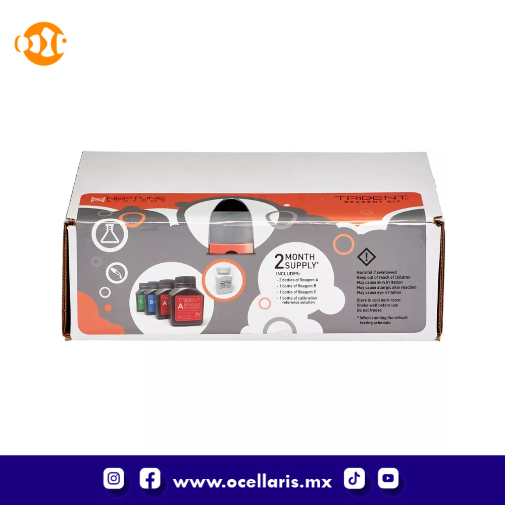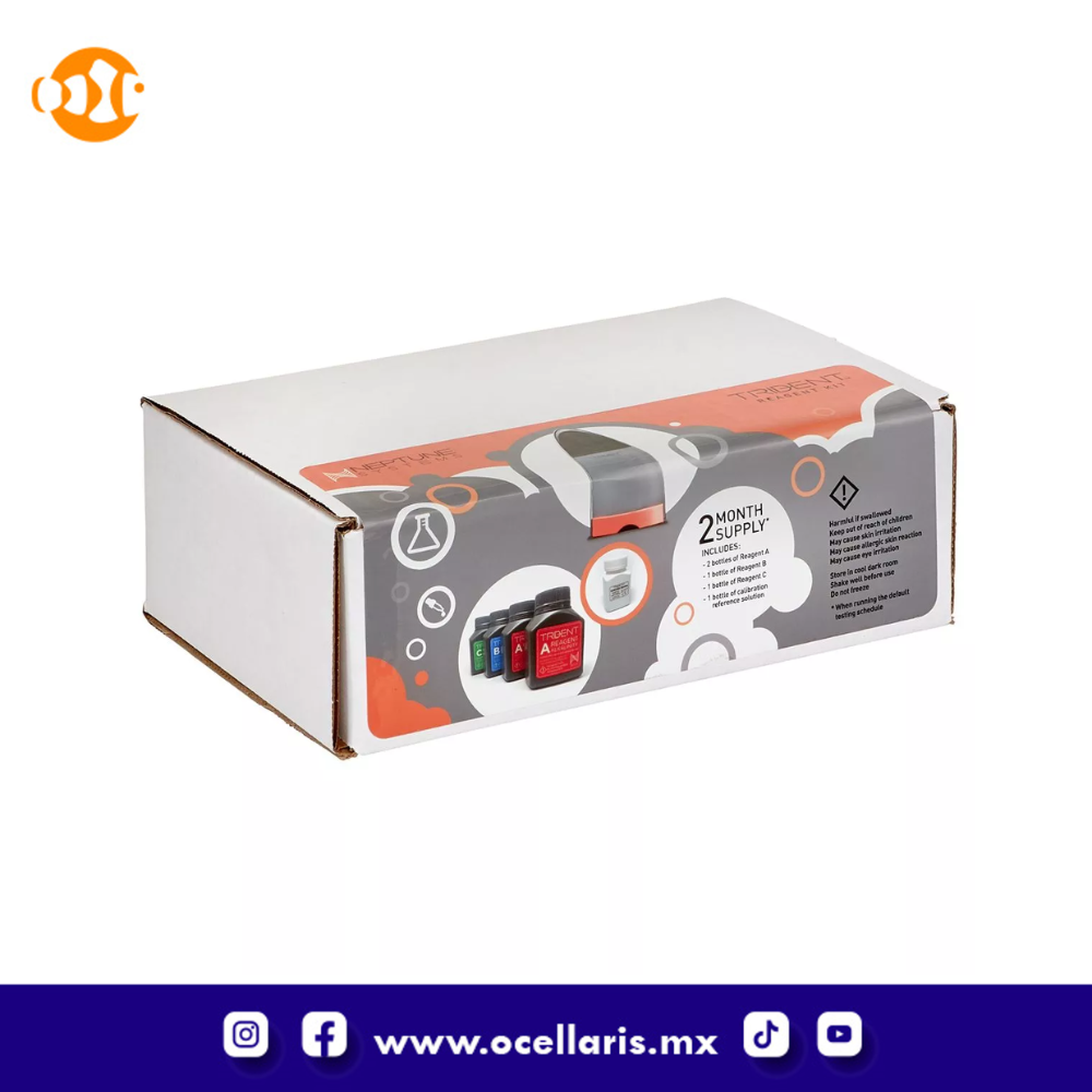 El kit de reactivos de repuesto de Neptune Systems viene con todo lo que necesita para cambiar los reactivos del sistema de análisis de agua marina Trident. Cada kit viene con botellas nuevas que se pueden colocar directamente en el soporte de reactivos de Trident y solo toma unos minutos cambiar las viejas por las nuevas. Cantidad de Pruebas: Según el programa de prueba predeterminado de 4x alcalinidad, 2x calcio y 2x magnesio por día, el kit de reactivos durará aproximadamente 2 meses antes de que se requiera un nuevo reactivo.