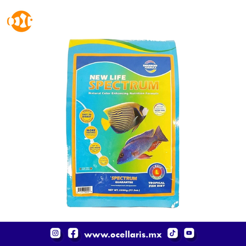 Esta dieta diaria multiusos original New Life Spectrum es para una amplia variedad de peces de acuario tropical. Incluye la fórmula principal de alta densidad Spectrum Nutrition. Para peces de agua dulce y marinos. Formulada para mejorar la salud y el color de sus compañeros de acuario, incluso ayudando a revertir la erosión de la cabeza, las aletas y la línea lateral relacionada con la desnutrición. Este alimento tiene proteínas marinas de alta calidad y fácil digestión (como krill antártico entero y calamar), algas y algas marinas (incluyendo espirulina, kelp y clorella). Hay flotabilidad negativa (la mayoría de los pellets se hundirán). Mejora naturalmente el color de sus peces sin hormonas añadidas. Sin colorantes, sabores ni conservantes artificiales. Incluye ajo para la salud del sistema inmunológico. Pellets de 3 mm - 3,5 mm. La mayoría de los pellets se hundirán (alta densidad). 2200 gramos.