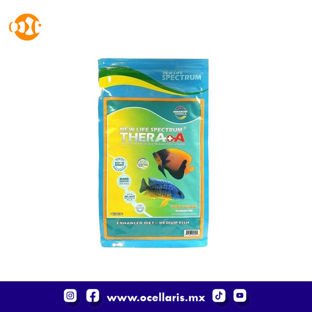 New Life Spectrum Thera+A Medium Fish es una dieta extra rica en nutrientes para peces, fortificada con ajo extra para fortalecer el sistema inmunitario en un pellet pequeño. Ideal para peces estresados, incluso al introducir nuevos peces en su acuario (así como para el estrés ambiental). Se puede usar como dieta diaria. Contiene una versión mejorada de la fórmula de nutrición Spectrum para realzar el color. Los pellets premium para peces New Life Spectrum están formulados para mejorar la salud y el color de sus compañeros de acuario. De hecho, están respaldados por la garantía Spectrum, que no solo proporciona vitalidad y vitalidad, sino que también revierte los problemas relacionados con la desnutrición que pueden causar erosión de las aletas, la cabeza y la línea lateral. Cada pellet de New Life Spectrum está repleto de ingredientes premium de alta calidad, como krill antártico entero, calamar, espirulina, ajo, omega-3, alga wakame y más. El resultado es una dieta diaria completa y altamente digestible que contiene toda la nutrición que sus peces necesitan en un solo alimento. Además, New Life sabe que el color es el resultado natural de un pescado sano (junto con ingredientes ricos en potenciadores naturales del color como el betacaroteno). Pellets de 2 mm a 2.5 mm. La mayoría de los pellets se hunden (alta densidad). 600 gramos.