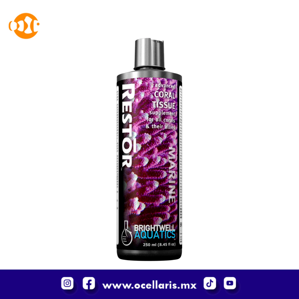 Brightwell Aquatics Restōr es un complejo de aminoácidos y ácidos grasos derivados de peces y crustáceos marinos; es una fuerte fuente de EPA, DHA y otros ácidos grasos omega-3, así como de pigmentos naturales. Restōr fue formulado específicamente para el cuidado de corales y sus aliados que: han sido colocados recientemente en un nuevo acuario y se están adaptando a la nueva iluminación; han estado expuestos recientemente a temperaturas elevadas prolongadas (lo que induce la expulsión de zooxantelas simbióticas, conocida como “blanqueamiento”); han sufrido daños en los tejidos ya sea por fragmentación o propagación, o por las actividades de pastoreo no deseadas de los habitantes del acuario.