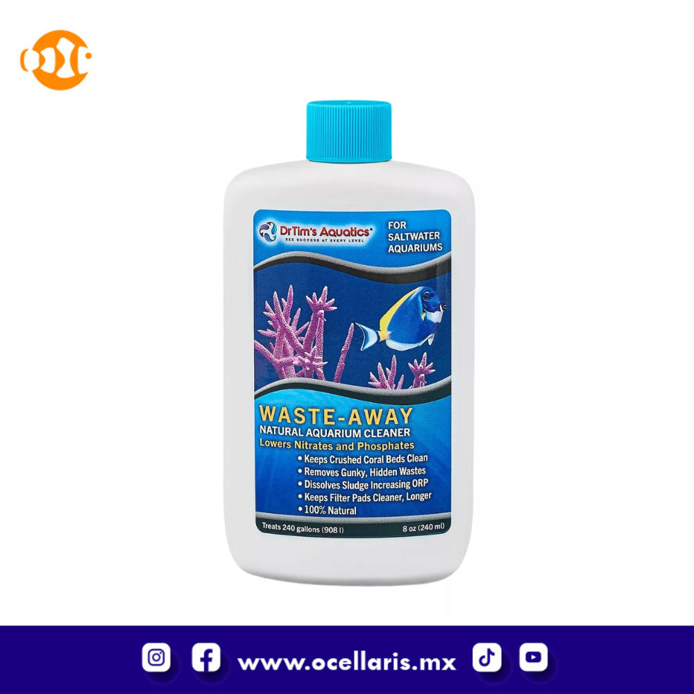 ¡Elimine la suciedad, el lodo y los desechos ocultos! Dr.Tim's Waste-Away es un aditivo bacteriano 100% natural que ayuda a disolver lodos y desechos ocultos. El uso de Waste-Away también ayudará a aumentar el ORP de sus tanques y la producción de su skimmer de proteínas.
